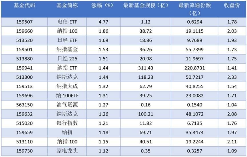 根据巨灵财经统计的数据显示,2025年10月22日场内ETF基金中电信ETF(159507)领涨,涨幅为4.77%,排名靠前的纳指100(159660)、日经ETF (513520)、纳指基金(159501),涨幅分别为1.86%、1.69%、1.53%。