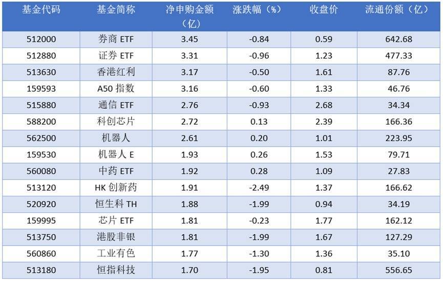 细分到资金流动情况上来看,2025年10月22日净申购金额最大的为券商ETF (512000),当日净申购金额为3.45亿元。排名靠前的证券ETF (512880)、香港红利(513630)、A50指数(159593),申购金额为3.31亿元、3.17亿元、3.16亿元。