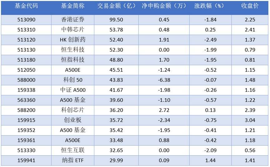 从成交金额上来看,2025年10月22日成交额最大的是香港证券(513090),交易金额99.50亿元。排名靠前的中韩芯片(513310)、HK创新药(513120)、恒生科技(513130),成交额分别为53.78亿元、52.40亿元、52.30亿元。