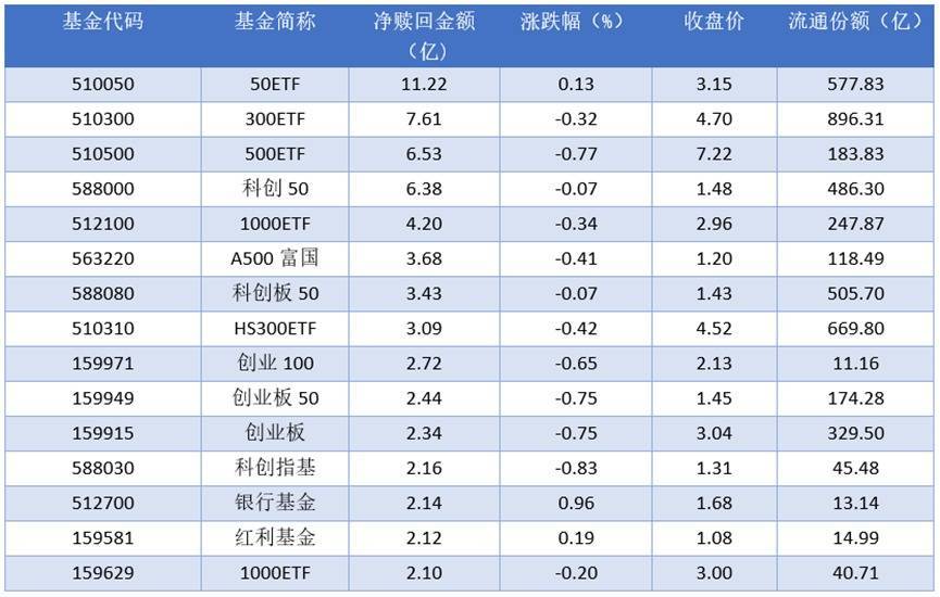 资金流出方面,2025年10月22日净赎回金额最多的是50ETF (510050),赎回金额11.22亿元。排名靠前的300ETF (510300)、500ETF (510500)、科创50 (588000),赎回金额分别为7.61亿元、6.53亿元、6.38亿元。