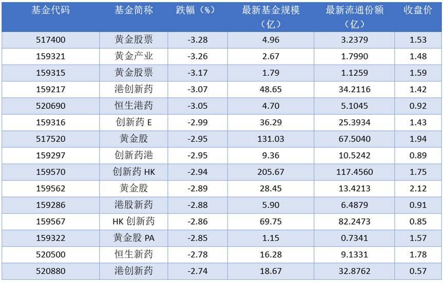 下跌方面,2025年10月22日跌幅最大的是黄金股票(517400),跌幅达到3.28%。排名靠前的黄金产业(159321)、黄金股票(159315)、港创新药(159217),跌幅分别为3.26%、3.17%、3.07%。