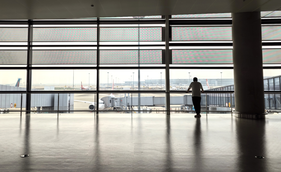 记忆侧重于引人注目的一面。那些画面过目不忘,指向天时地利人和;时代与日常生活碰撞,融合前行。我说的是机场——地处天地之间,人们从这里上天,或者着地,机场就有点替天行道的意思;一个属于记忆和遗忘的地界,出发,同时又是到达的区域;情感得以凝聚、升华或回归的余地。我的目光掠过,在一些符号般的标志物上短暂停留。我不经常光顾机场。我看到的飞机大多是在天上而非地上。机场便常年被我隐匿于内心某个角落。天圆地方,生死悬空,人生的某个短促时段里,起飞或降落,命悬一线;我好像要暂别人世,升空去往天堂的栅栏边绕行一圈,默默地观望沉思,然后转身离开。每一次重回大地,脚踏实地之后总觉得倍感珍惜。这是我第一次坐飞机出行的感受,也是我第一次对机场的真切体验。